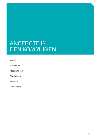 ANGEBOTE IN DEN KOMMUNEN Alfter Bornheim Meckenheim Rheinbach Swisttal Wachtberg Foto: ChocoPie_/shutterstock.com 74 75